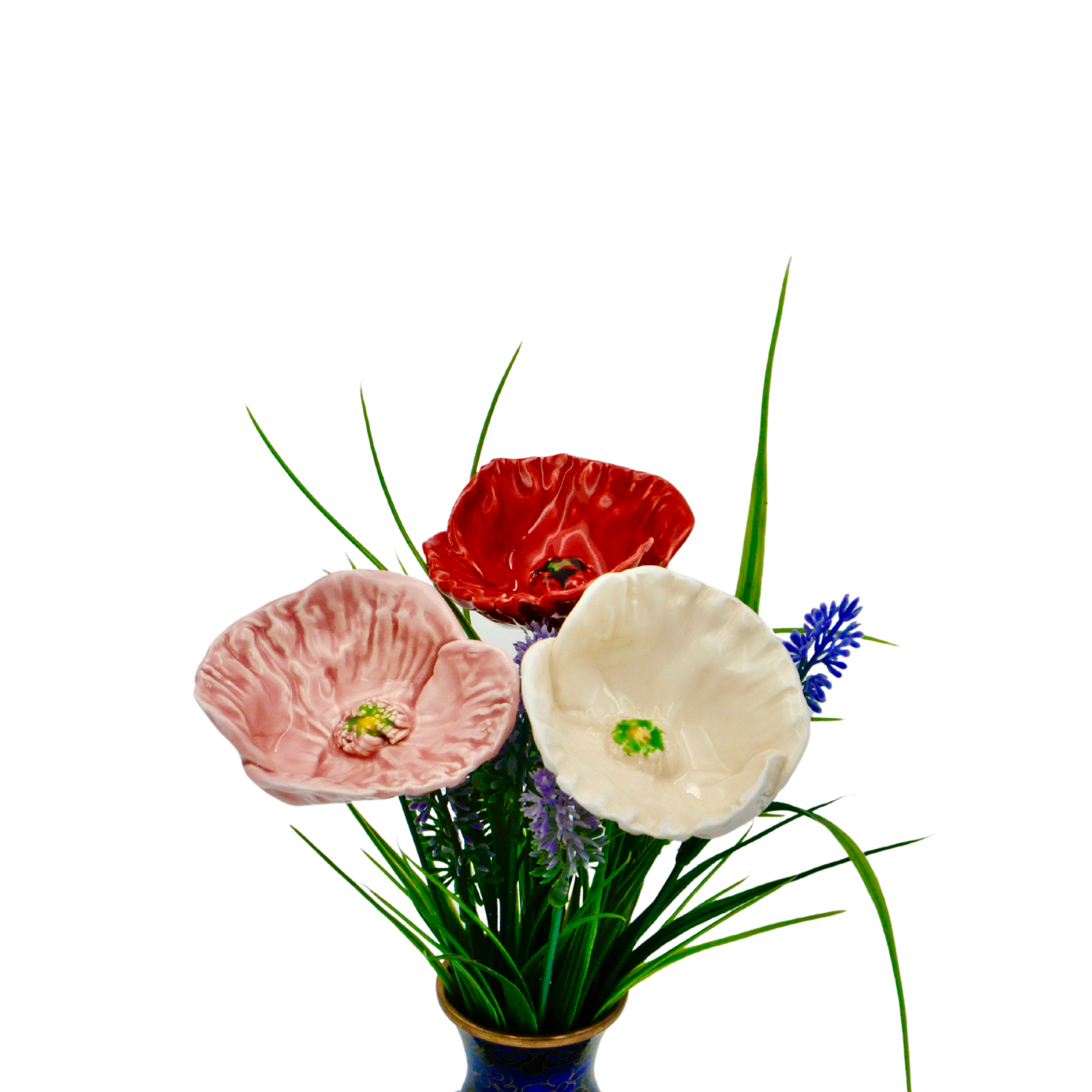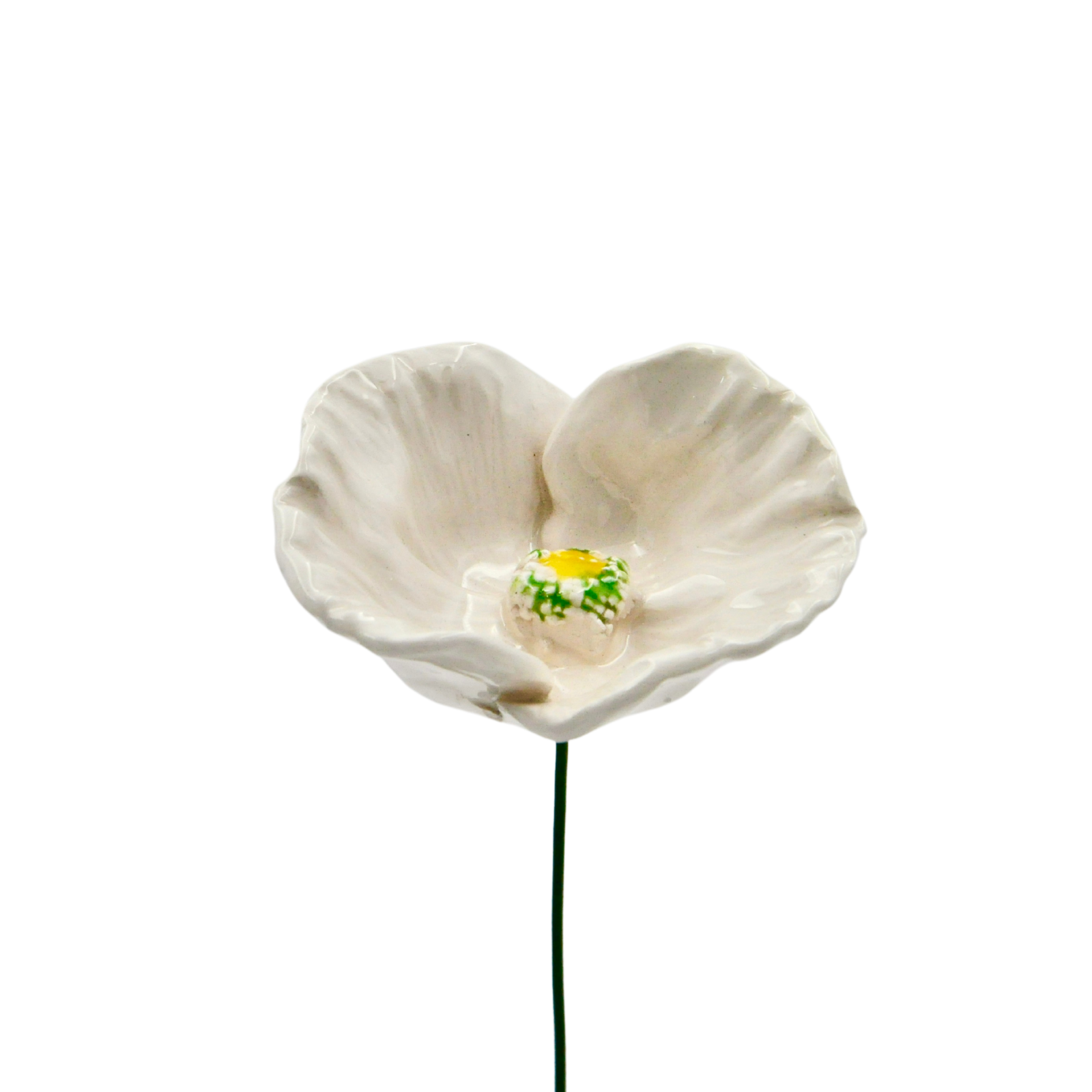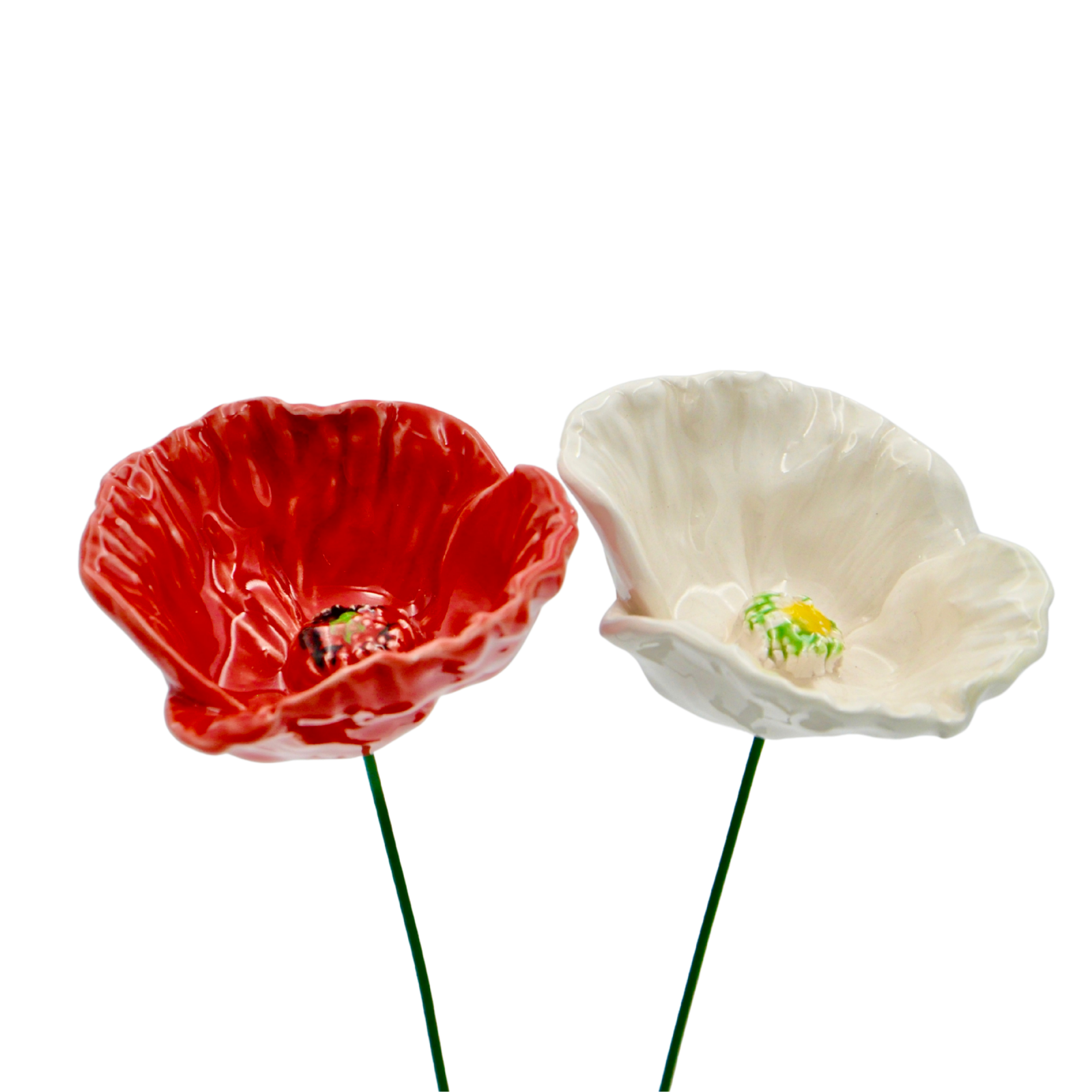 Acesta este Macul nostru format din ceramică și este o operă de artă unică, modelat manual cu atenție, prezentând mici diferențe ce subliniază autenticitatea din această cauză nici o floare nu este la fel ca cealaltă. Cu culori vibrante, glazură ecologică strălucitoare și un fir metalic flexibil, această floare delicată emite eleganță, dar datorită elementelor ascutite, nu este potrivită pentru copii sub 3 ani.